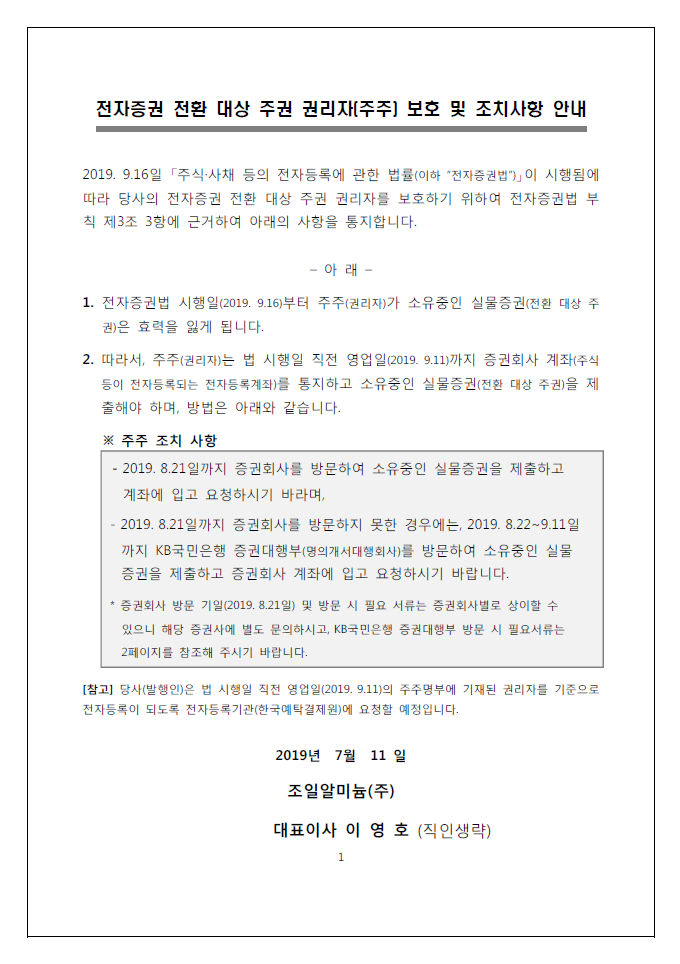 전자증권 전환 대상 주권 등의 권리자 보호를 위한 통지문 2019.07.12