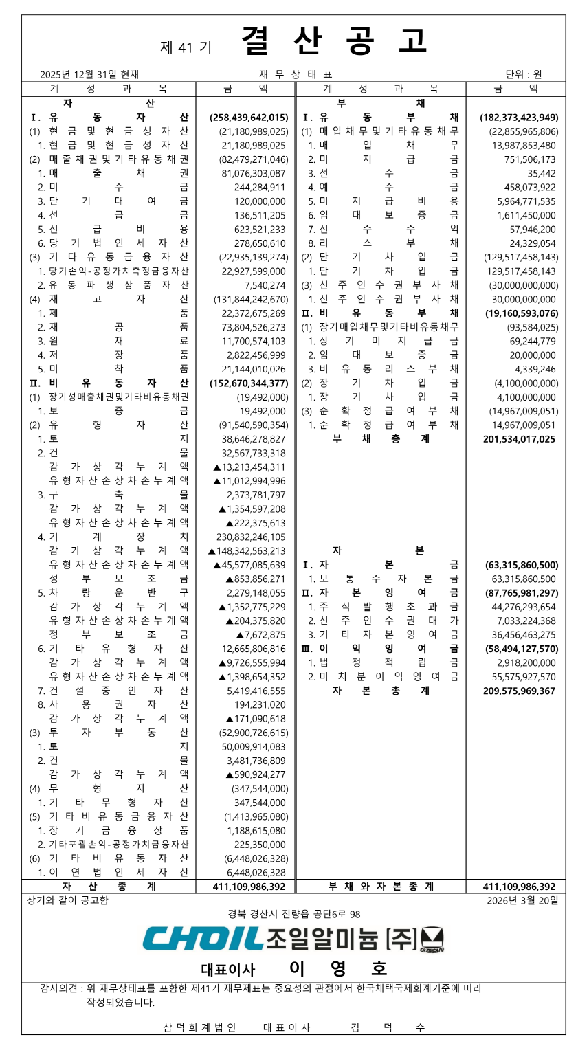 제41기 결산공고 2026.03.20