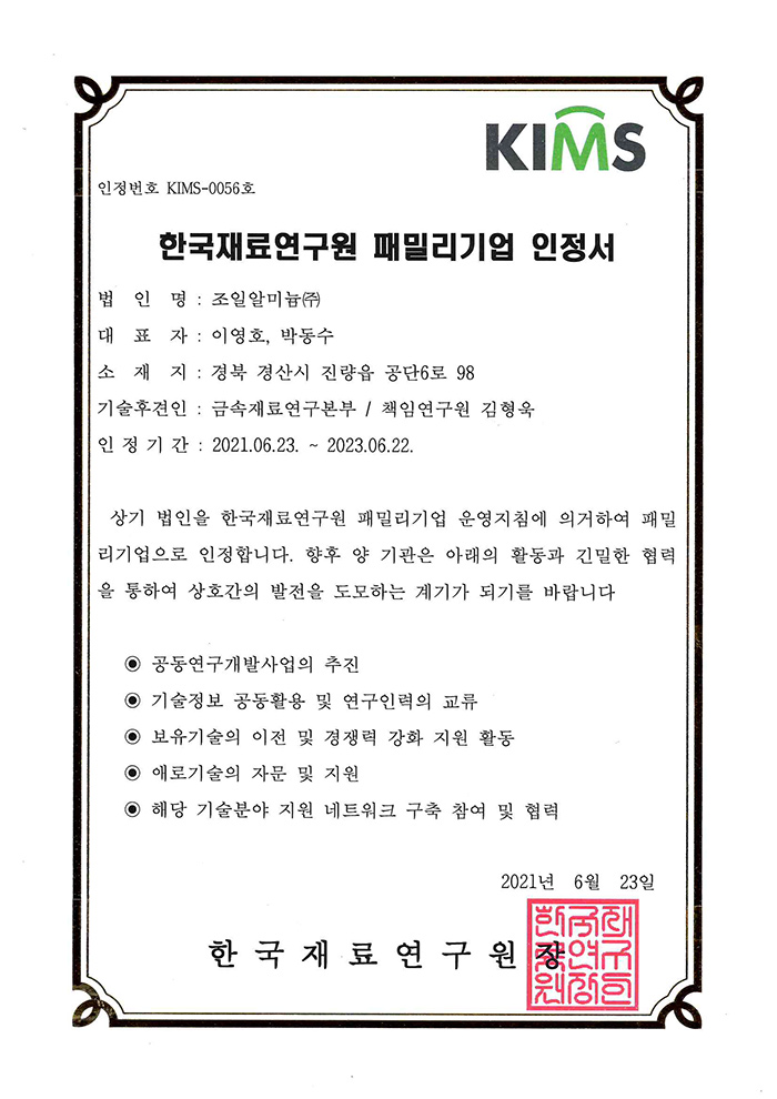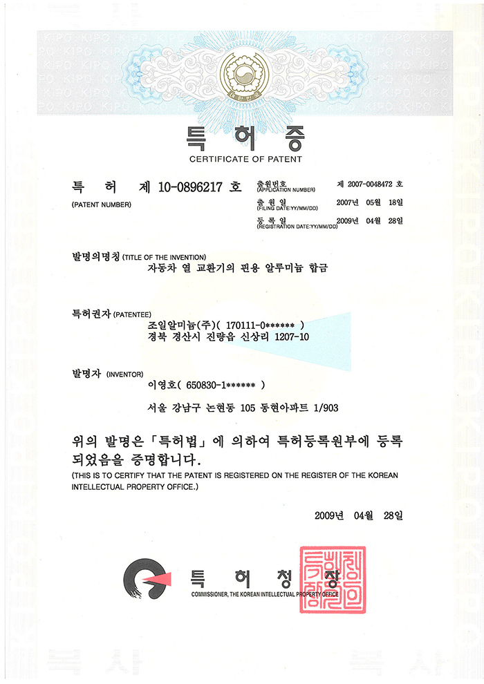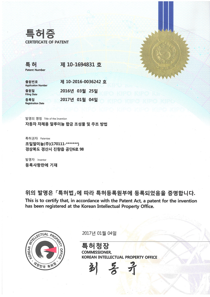 알루미늄 합금 특허증